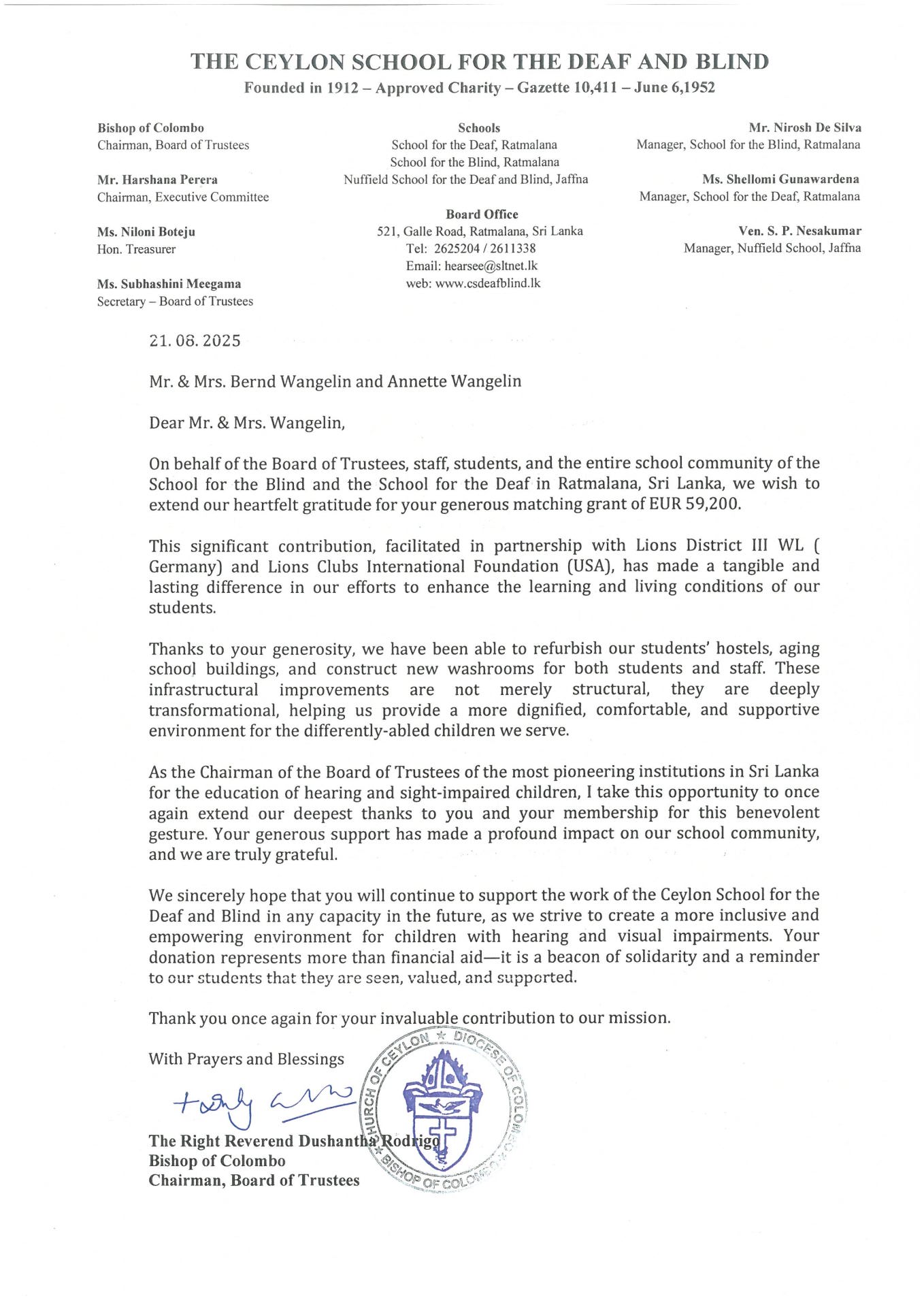 Über den Brief des Bischofs von Colombo, in dem er seinen Dank für unser Engagement zum Ausdruck bringt, haben wir uns sehr gefreut.
